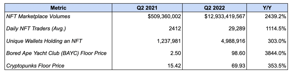 - NFT Marketplace Volumes erupted 2439.2% from $509.36M to $12.93B. This tracks trading activity on marketplaces OpenSea, Foundation, LooksRare, Rarible, and Superrare. This growth is likely due to the secular growth of the NFT ecosystem between Q2 2021 and Q2 2022 — in particular the rise in popularity of PFP collections.